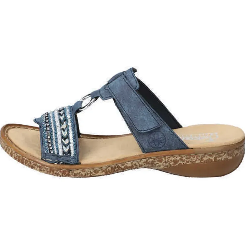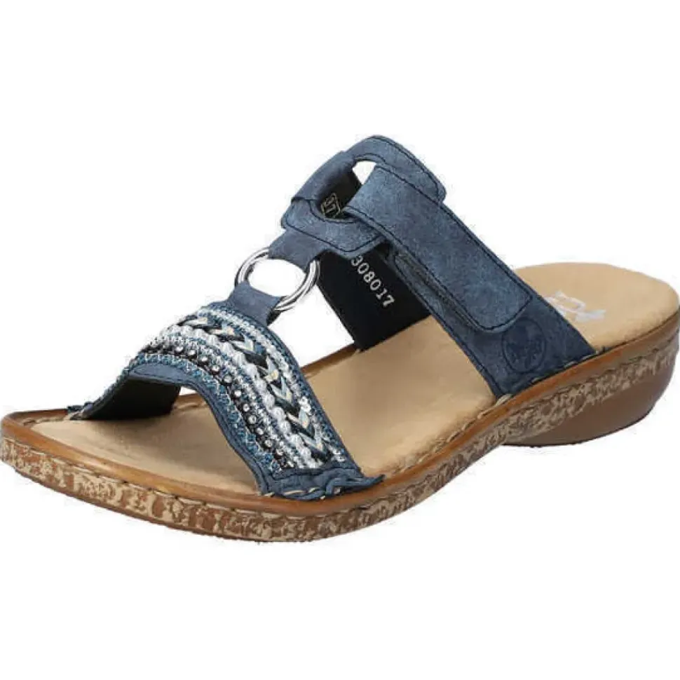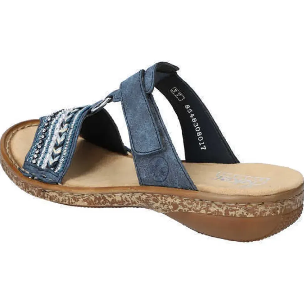 Diese blaue Rieker Pantolette mit kleinen Schmucksteinen und Pailletten ist nicht nur modisch raffiniert, sondern dank des Klettverschlusses und der bewährten Rieker Antistress-Laufsohle auch noch super bequem.