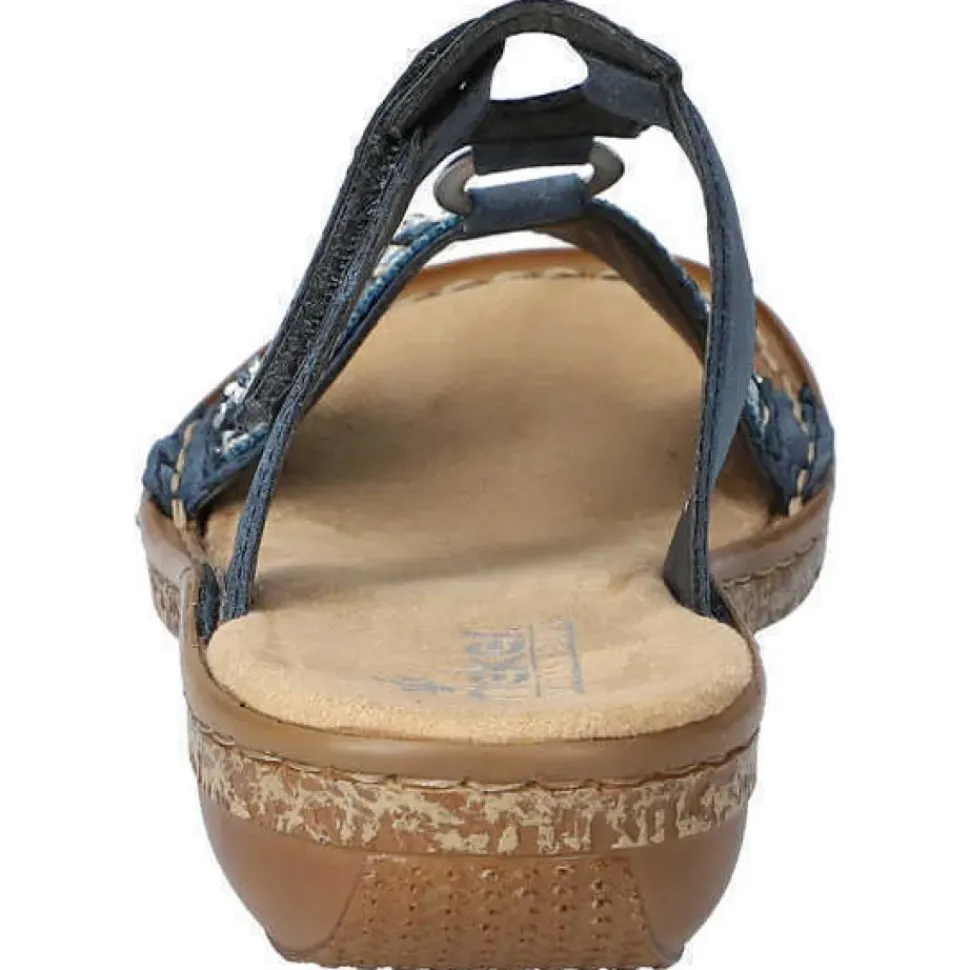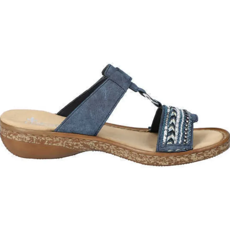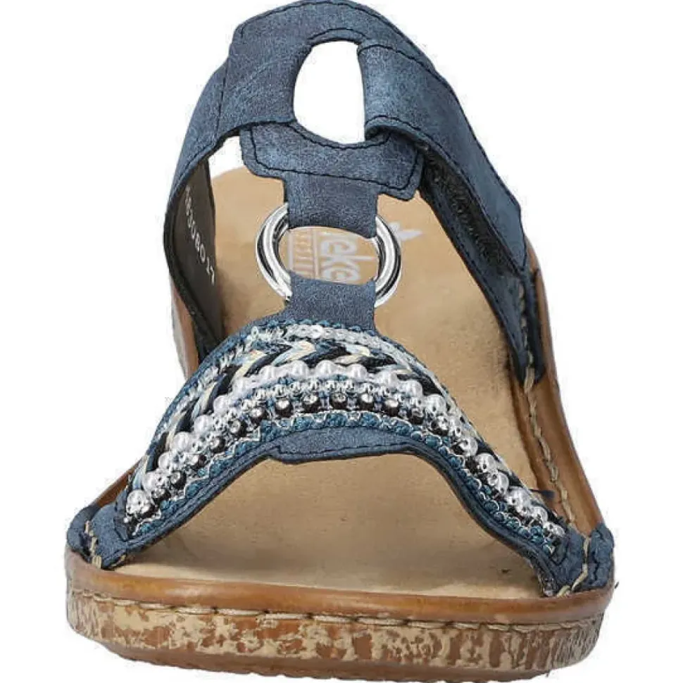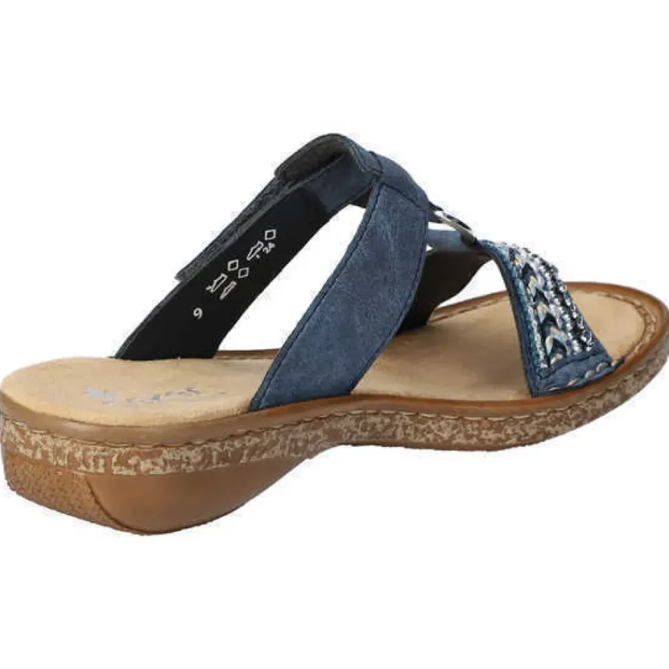 Diese blaue Rieker Pantolette mit kleinen Schmucksteinen und Pailletten ist nicht nur modisch raffiniert, sondern dank des Klettverschlusses und der bewährten Rieker Antistress-Laufsohle auch noch super bequem.