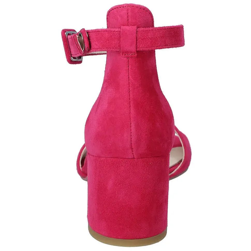 Zeigen Sie Stil mit diesen eleganten Sandaletten aus pinkem Samtleder. Das cleane Design wird durch den schönen Blockabsatz stilvoll unterbrochen, wodurch eine extravagante Silhouette entsteht.