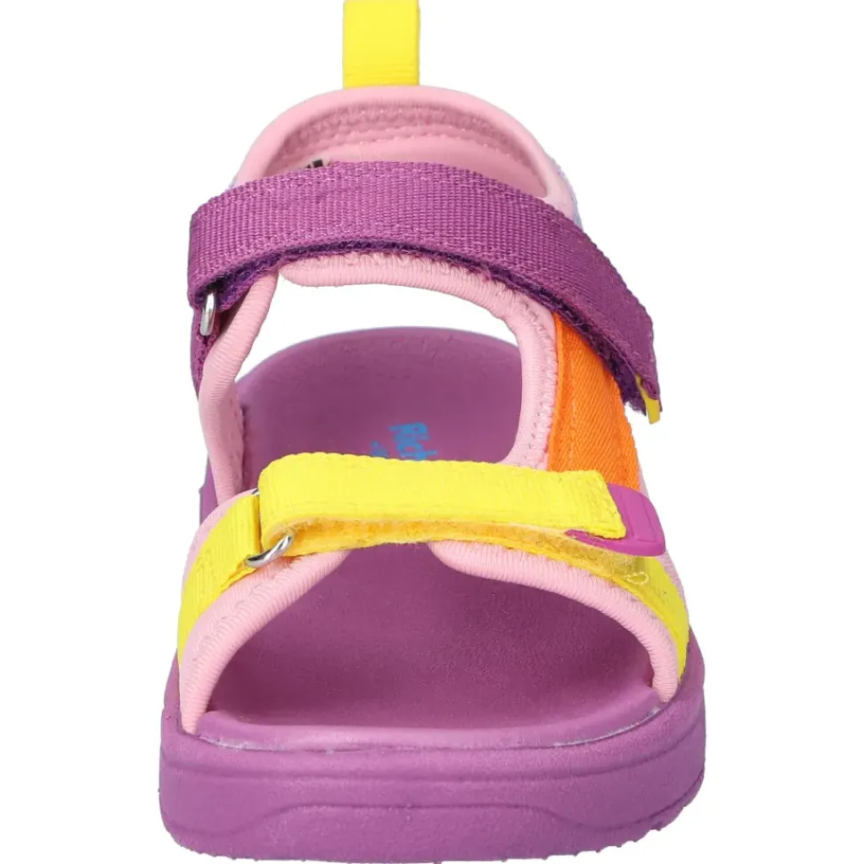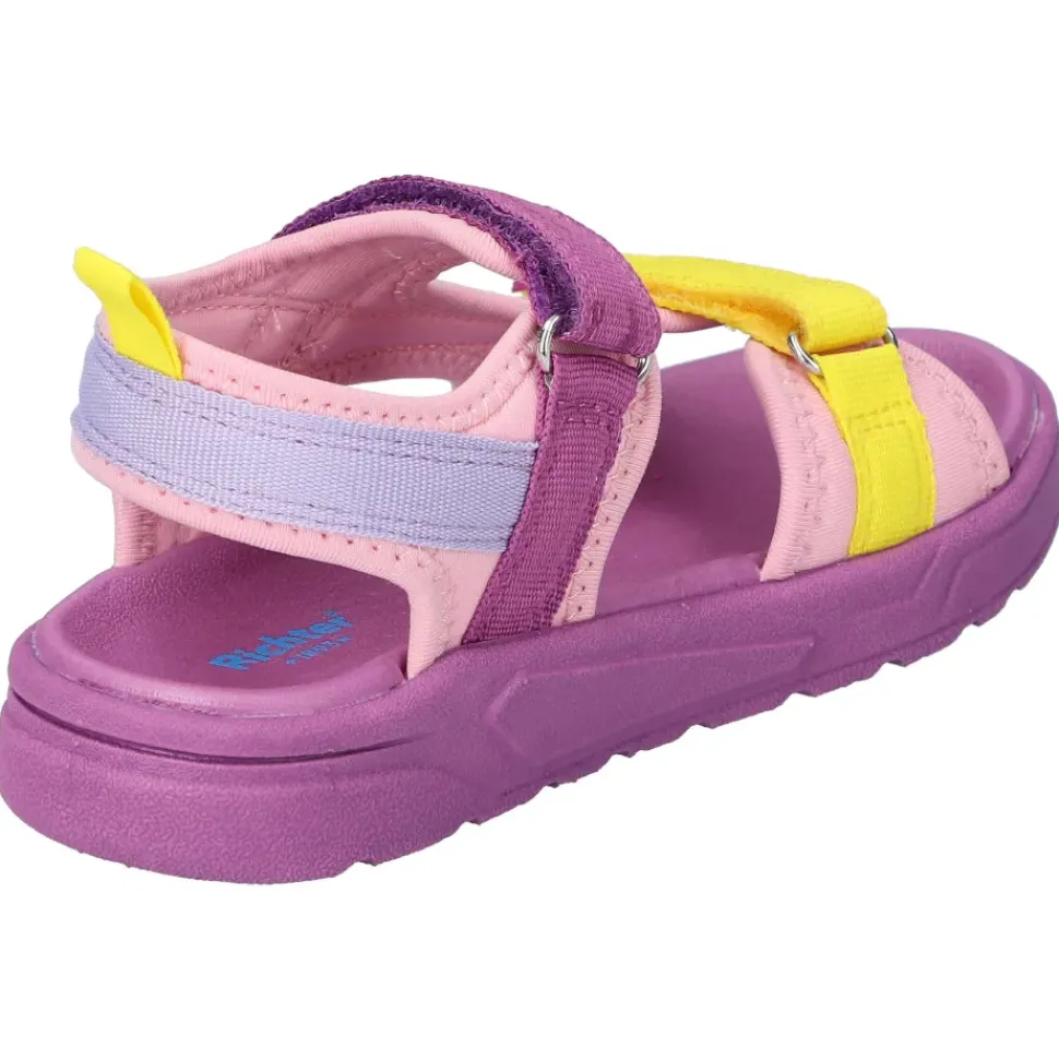 Farbenfrohe Kindersandalen von Richter. Sie sind ein echter Blickfang und durch den Klettverschluss wird das An- und Ausziehen zum Kinderspiel.