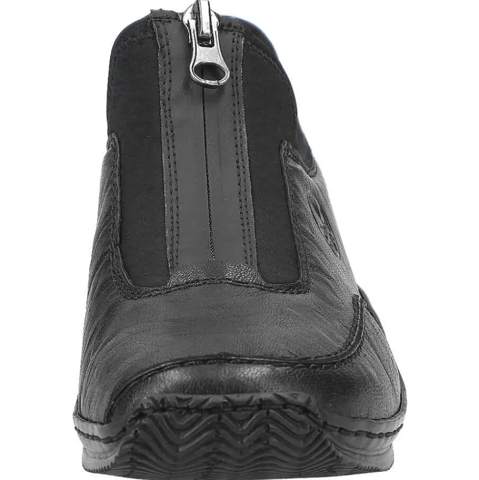 Ganz in schwarz präsentieren sich die Slipper von Rieker. Die Slipper überzeugen durch ein leichtes Tragegefühl und sind sehr bequem.