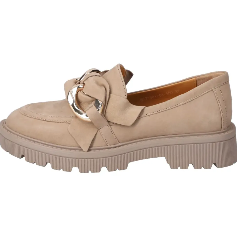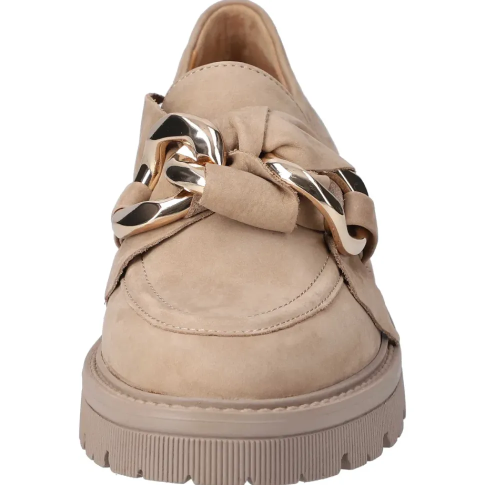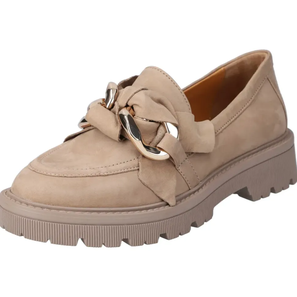 Ganz in Beige präsentieren sich die Slipper von Regarde le Ciel. Die Slipper überzeugen durch ein leichtes Tragegefühl und sind sehr bequem. Sie sind aus hochwertigem Leder gefertigt und die Kette ist ein absoluter Blickfang.