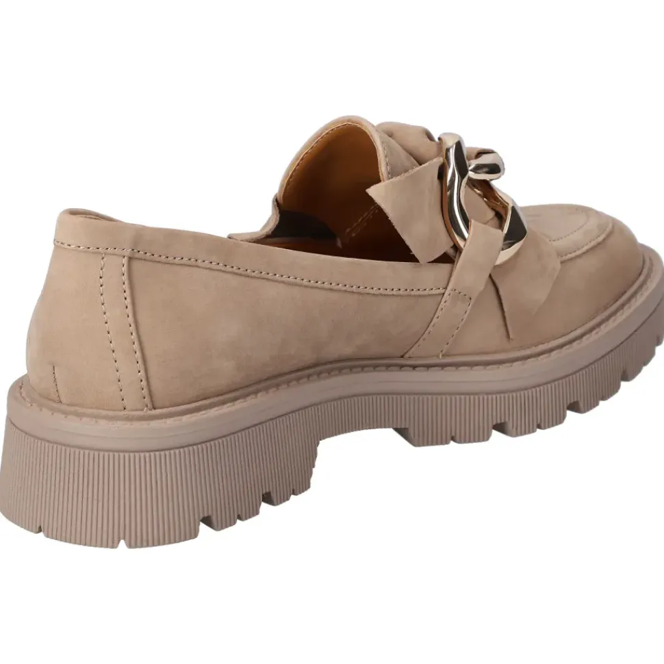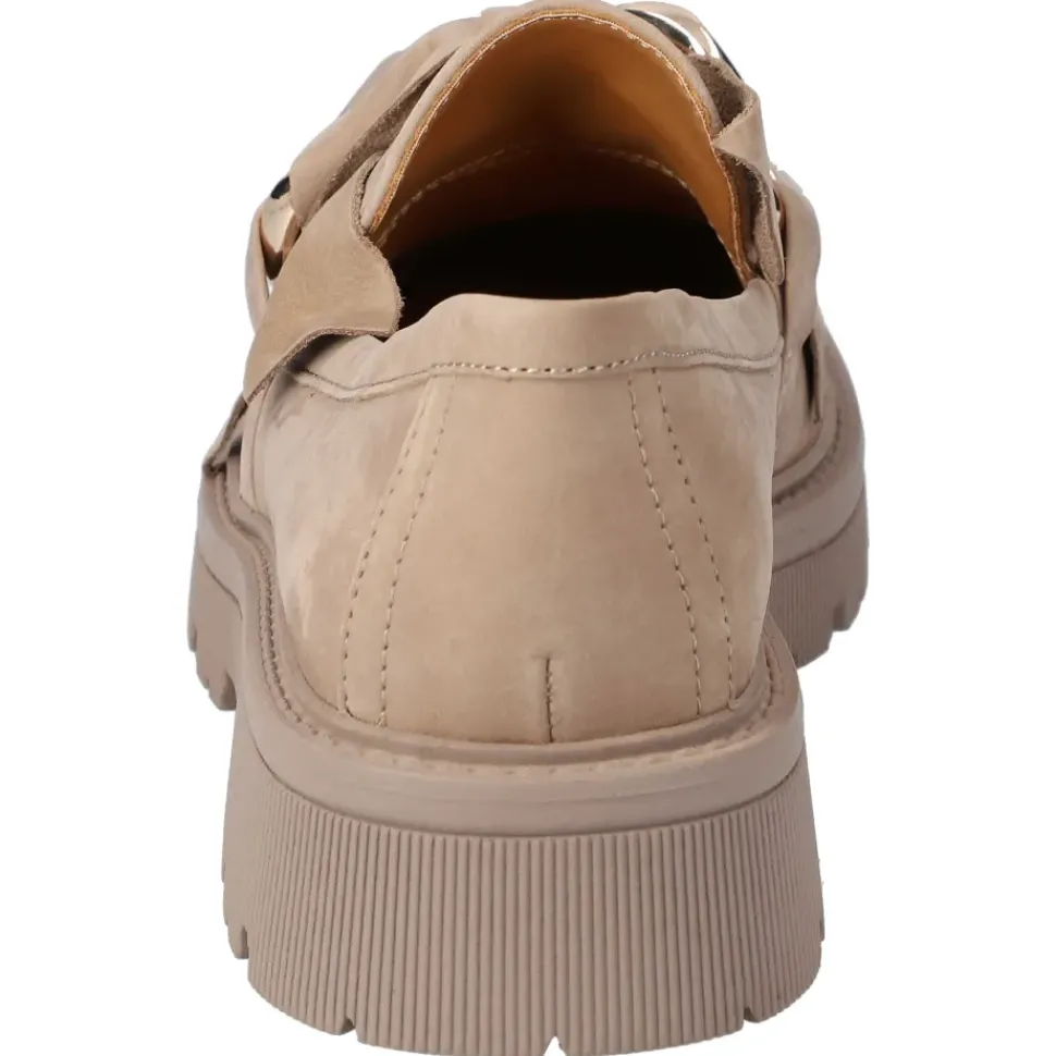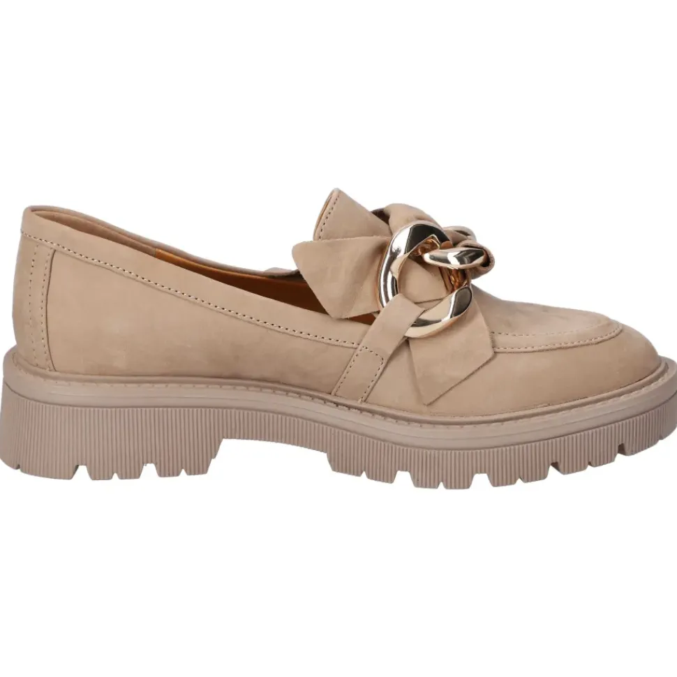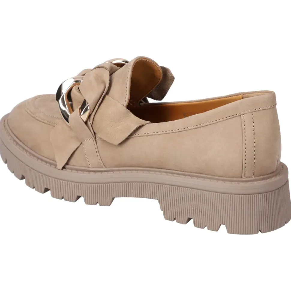 Ganz in Beige präsentieren sich die Slipper von Regarde le Ciel. Die Slipper überzeugen durch ein leichtes Tragegefühl und sind sehr bequem. Sie sind aus hochwertigem Leder gefertigt und die Kette ist ein absoluter Blickfang.