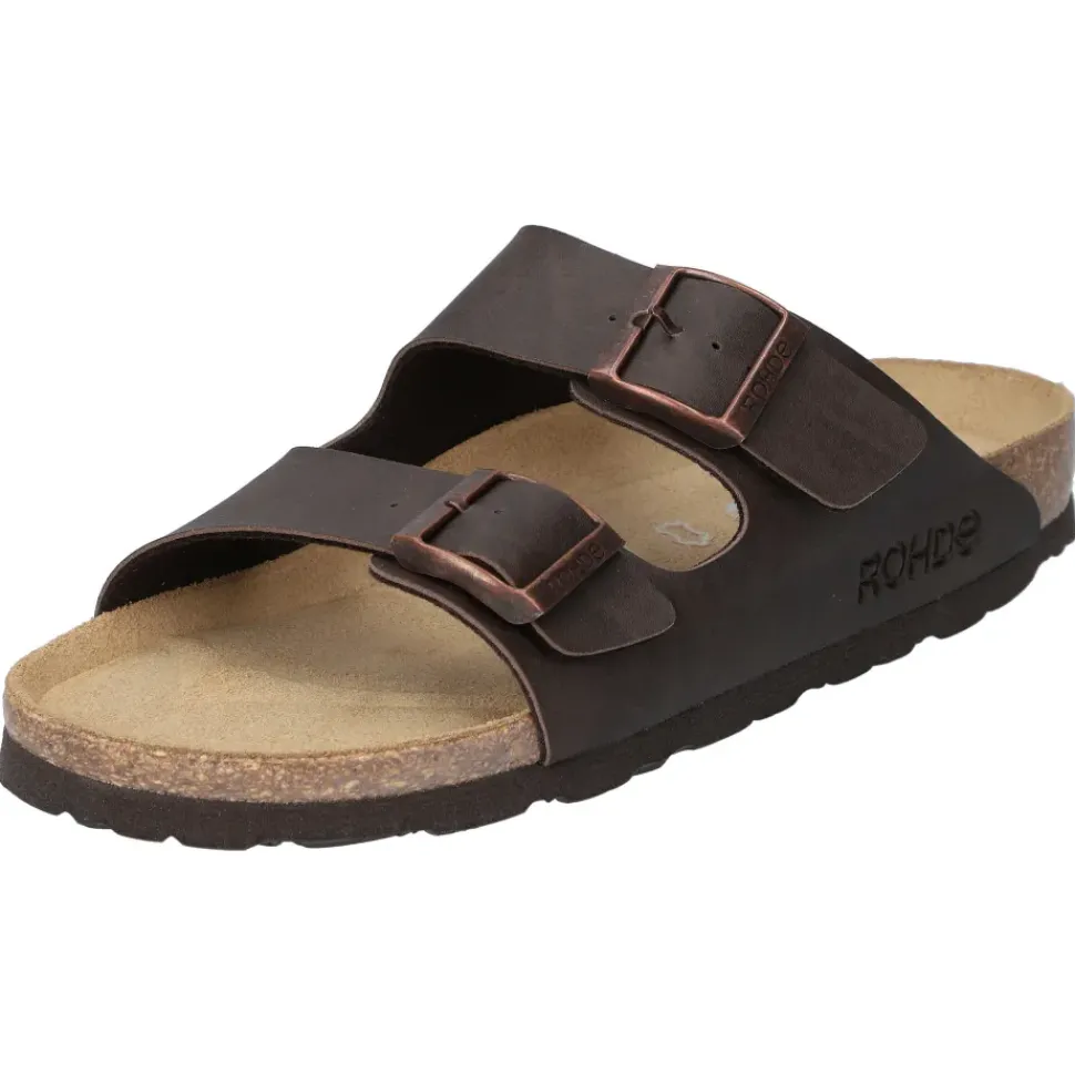 Diese braune Herren Pantolette von Rohde lässt sich durch die Schnallenverschlüsse individuell an Ihren Fuß anpassen. Das Fußbett aus Velourleder bietet optimalen Komfort.